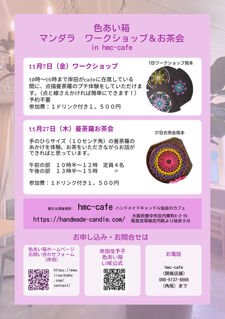 ワークショップはほぼ1日在席していますので、いらっしゃった方から点描曼荼羅のプチ体験をしていただく予定です。